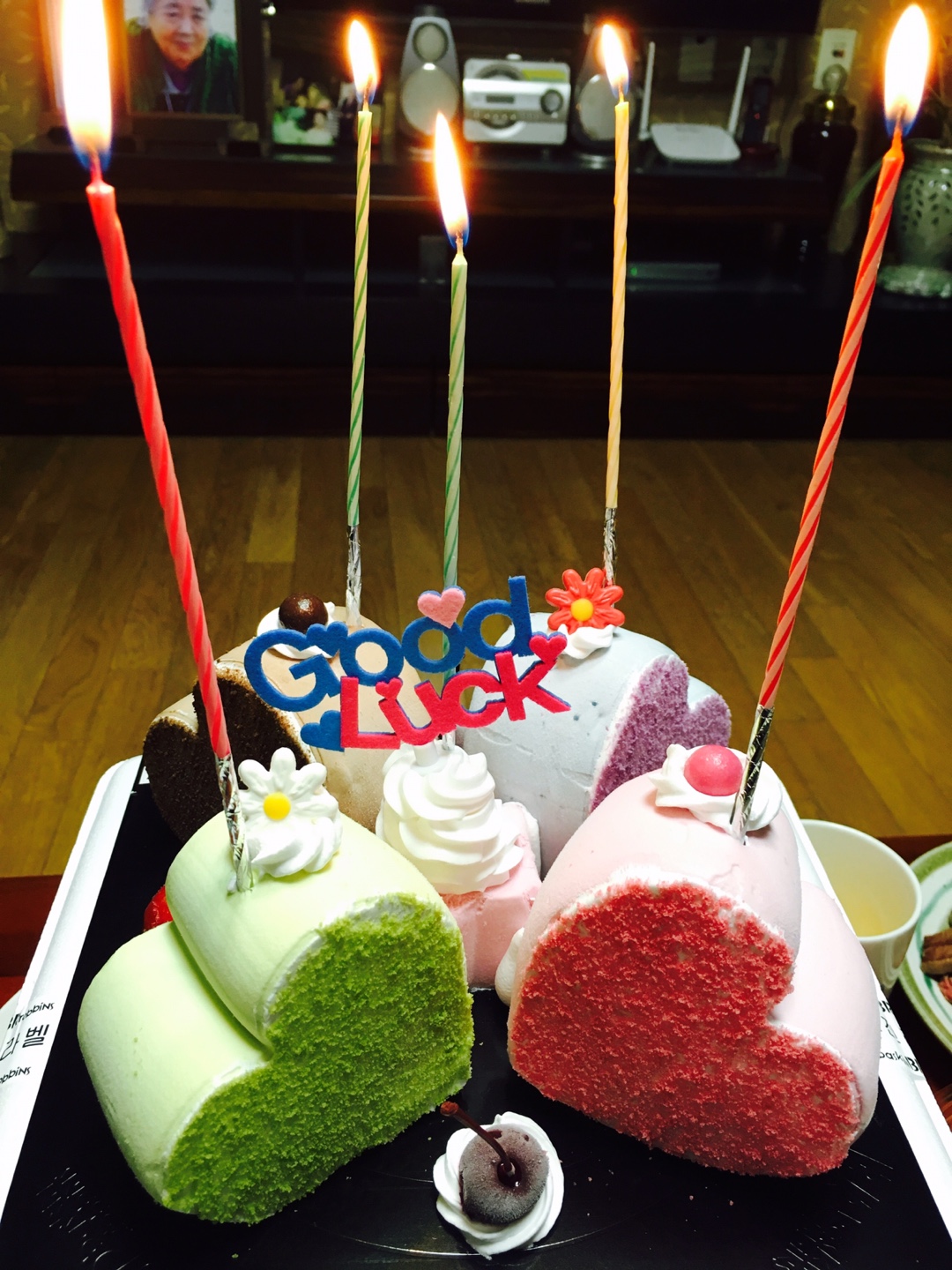 모여서 아이스크림 케잌에 촛불 붙여 축하해드렸어요...